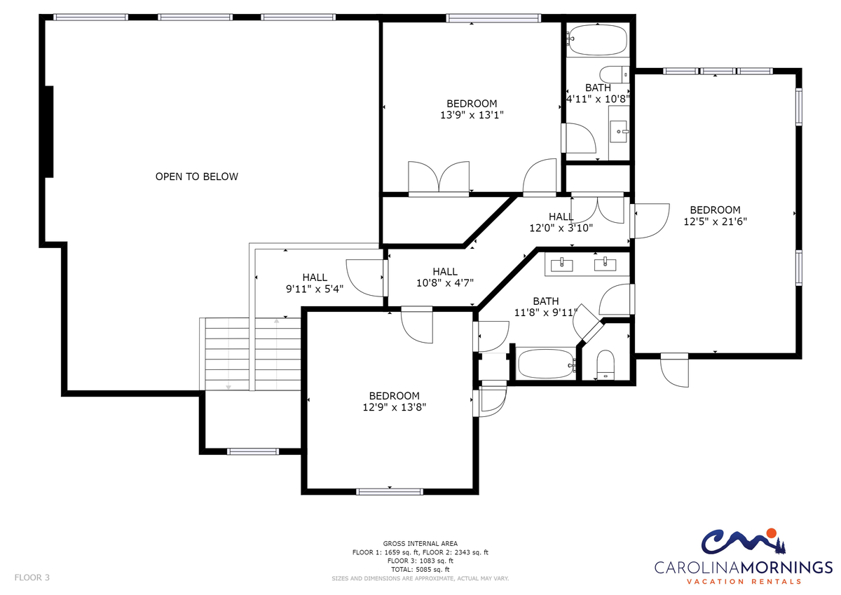 Upper Level: Bedroom Two - 1 King Bed, with Jack and Jill Bath, Bedroom Three - 2 Queen Beds, with Jack and Jill Bath, Bedroom Four - 1 Queen Bed, with attached Full Bath