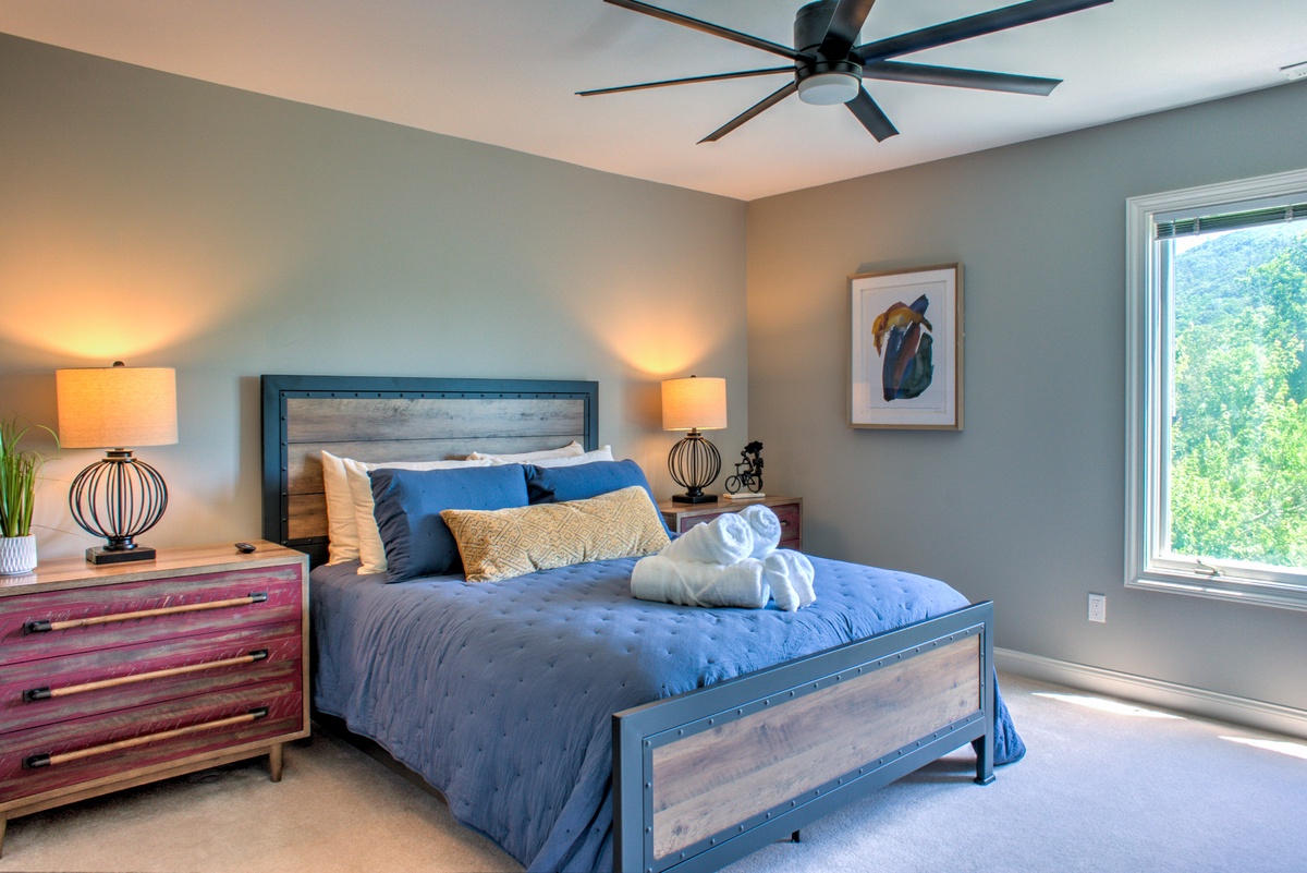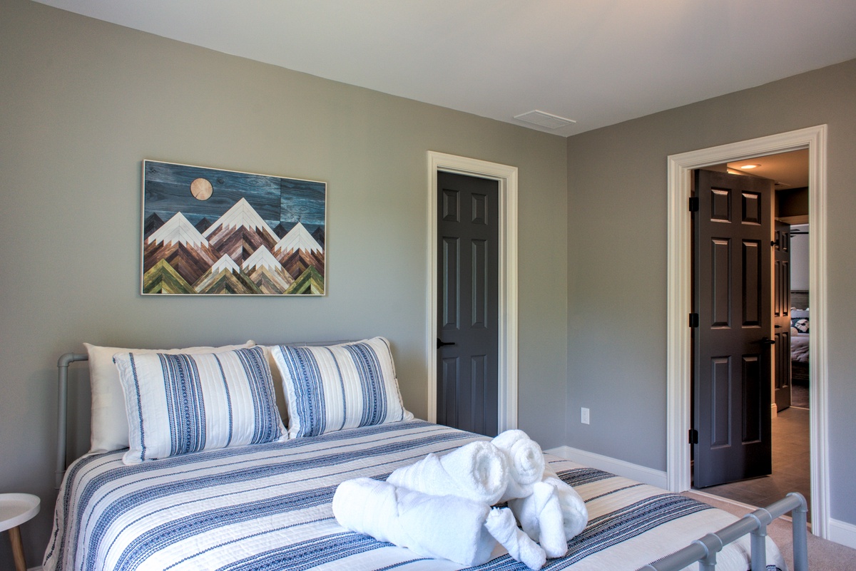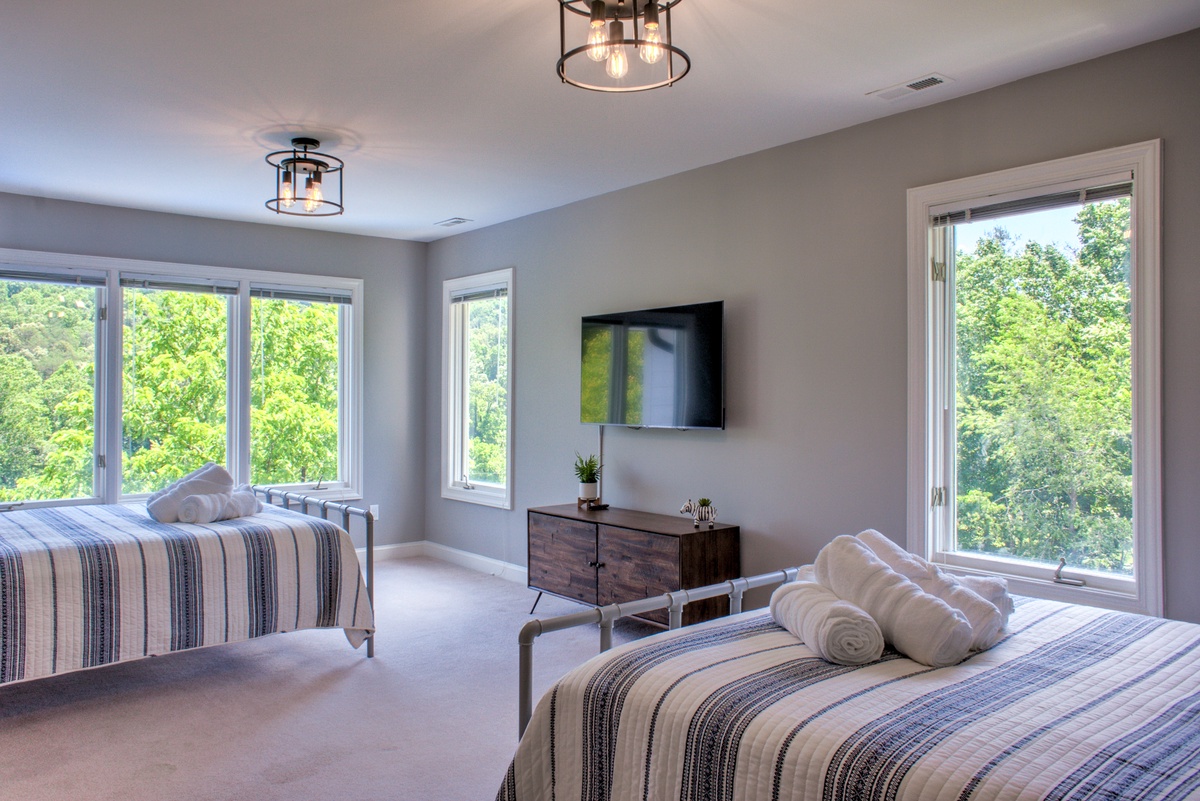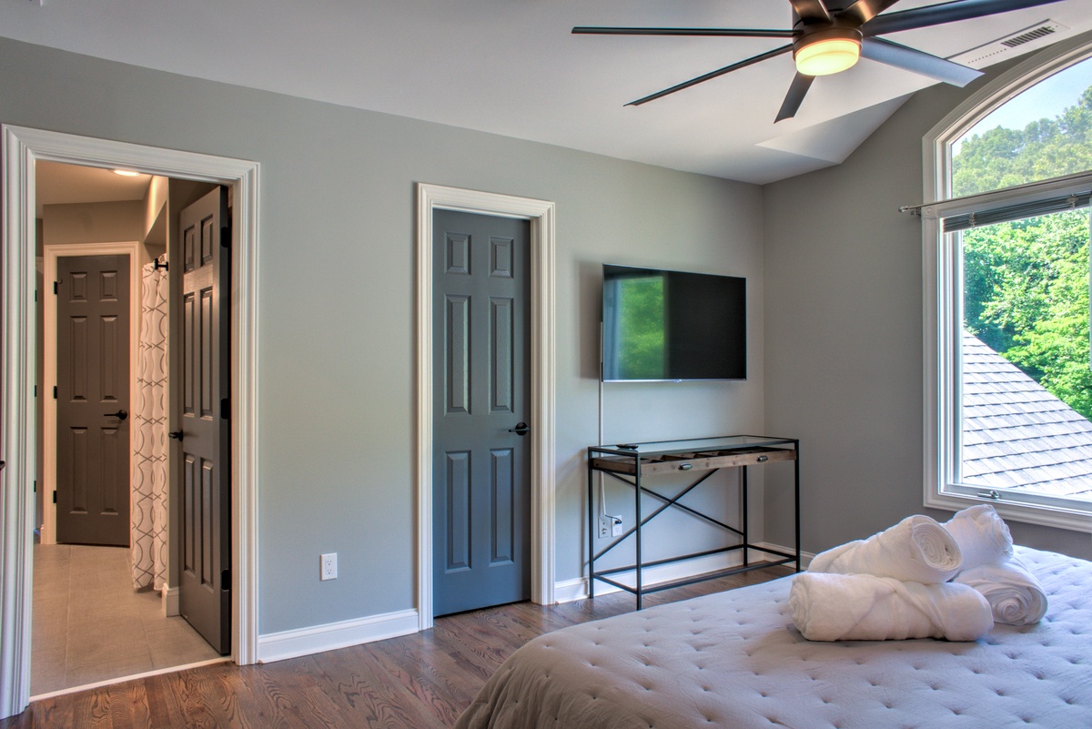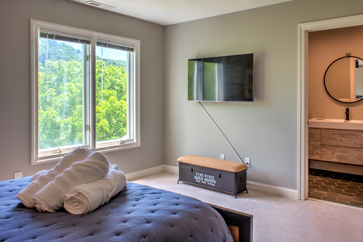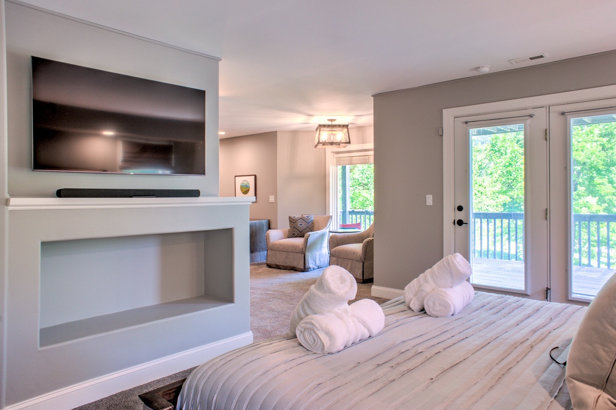 Everyone will appreciate the peacefulness of their own private quarters. Retire to the owner-on-main suite with its gorgeous bath featuring a huge walk-in shower and a deep soaking tub. The lower level offers a second main bedroom with a private walk-out porch and a cedar-lined closet. The whole family will catch some well-deserved "zzz's" with three beautifully decorated bedrooms on the upper level. Bonus: there's a large TV in all five bedrooms!