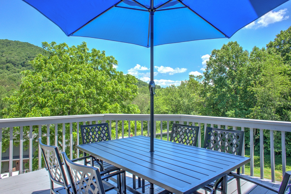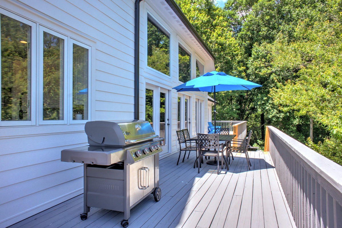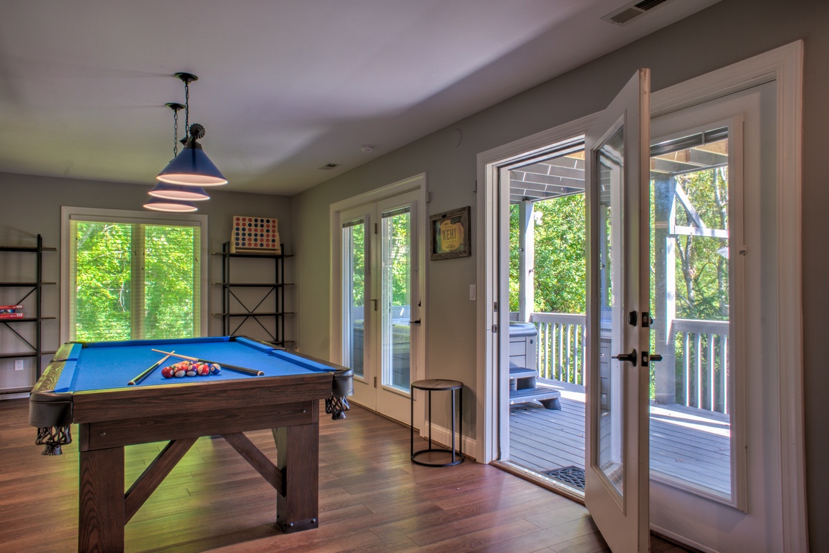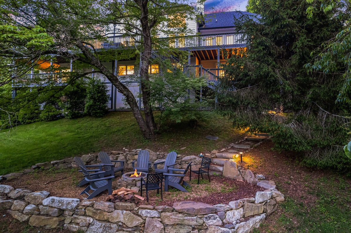 Blue Sky Manor welcomes you to Asheville in style! Conveniently located just south of Downtown Asheville, and only 2 miles to shopping and restaurants, this home is truly an elegant escape for all seasons with a hot tub and mountain views. Tons of natural light, gracious living spaces, and top-of-the-line furnishings define this luxurious 5,500-square-foot estate. Prepare to be "wow"-ed by the main living area's vaulted ceilings and contemporary decor. Three gas fireplaces on the main level add a cozy charm to the home. The fully equipped, spacious kitchen is sure to please even the most discerning guest, and there's three indoor dining tables, allowing plenty of seats. Make plans for a cookout with a gas grill and two outdoor dining tables on the spacious upper deck. Evenings at Blue Sky Manor take on a special ambiance - warm up by the stone-stacked, smokeless fire pit on the patio and then soak in the bubbly hot tub on the lower deck. The lower level living area gives your group room to spread out with a second full kitchen, a rec room, and a pool table & pinball machine.