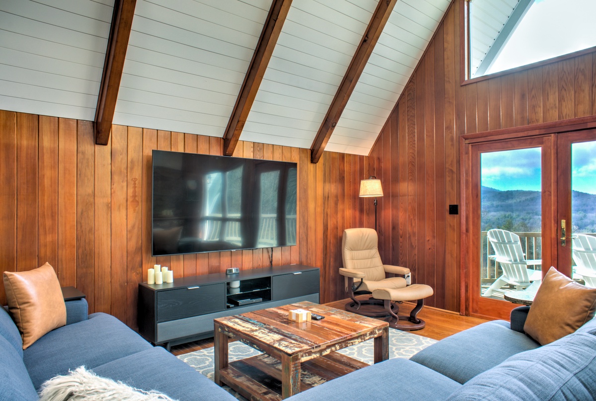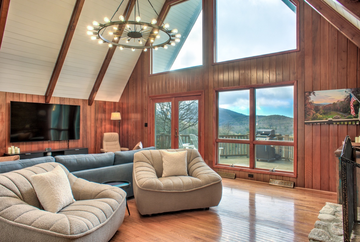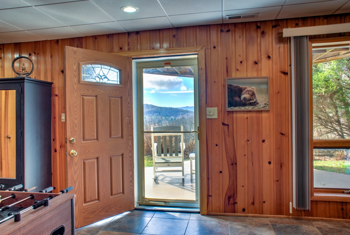 Peak A View is your own private estate only 10 minutes from downtown Asheville! Boasting year-round, long-range mountain views worthy of its clever name, this three-story gem sits atop a ridge in East Asheville and offers a convenient location and a paved driveway for easy access. The cozy living area with soaring ceilings features a wrap-around couch, huge picture windows to frame the mountains, and a gas fireplace to take the chill off from the mountain weather. Sit a while on the deck and watch the sunset, then head into town to check out Asheville's lively entertainment scene. The fully-equipped chef’s kitchen makes cooking for your group a breeze, along with a BBQ grill and a fantastic view of the main-level deck. Work at home with desk space available in three separate areas. A rec room on the lower level offers space to spread out. There are games to pass the time, including foosball, a golf putter mat, and arcade-style PacMan. Fitness buffs will love Peak A View - the well-equipped home gym will truly elevate your workout time. Even though you feel like a million miles away from all of your worries, this mountain home provides a perfect location for your mountain adventures. Your mountain dream vacation comes true at Peak A View!